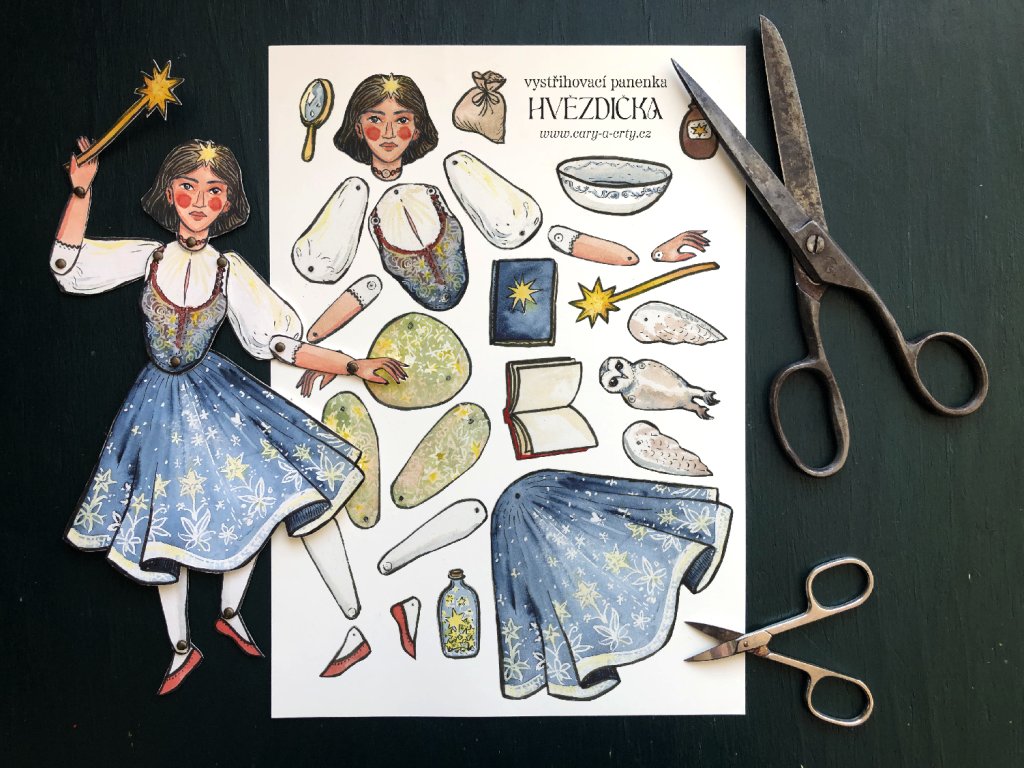 Panenky/panáčci jsou vytištěni na formát A4 spolu se svými věcičkami. Je potřeba je vystřihnout a spojit je hřebíčky, které najdete v balení.